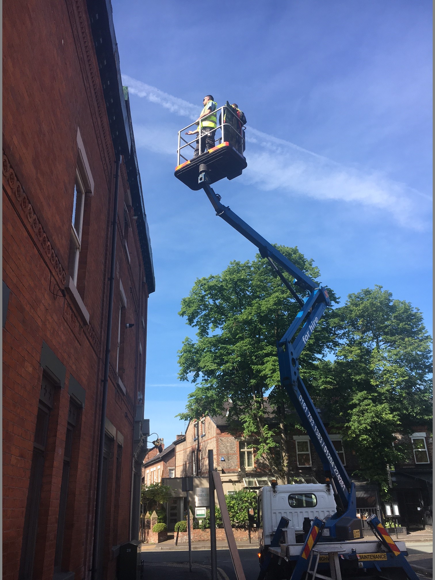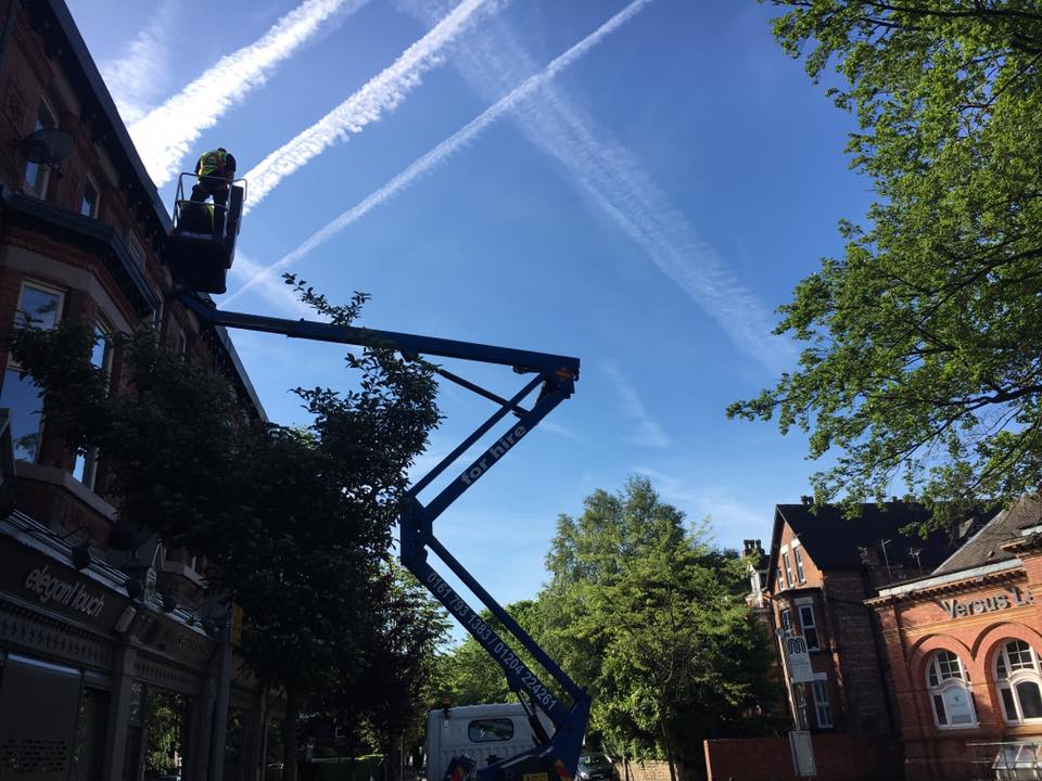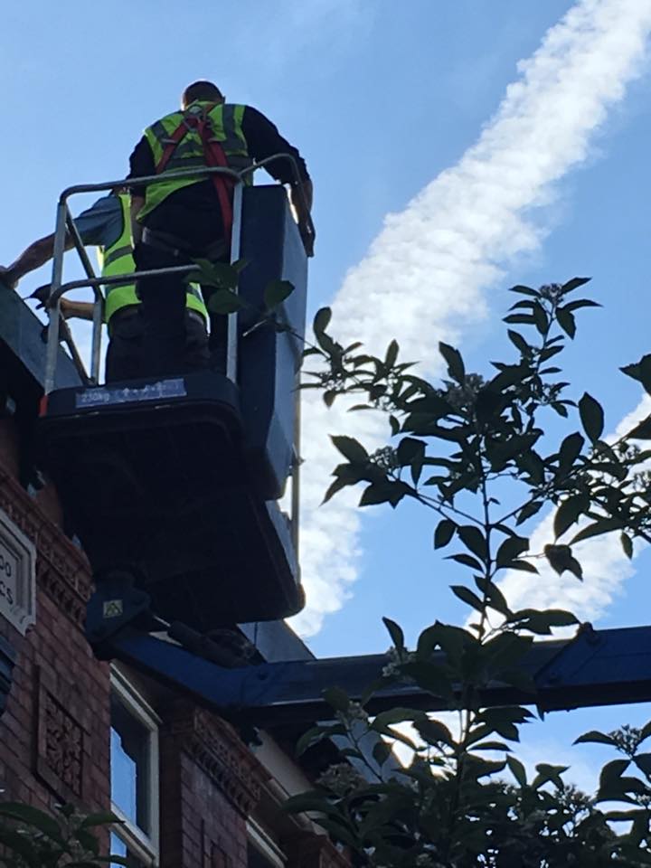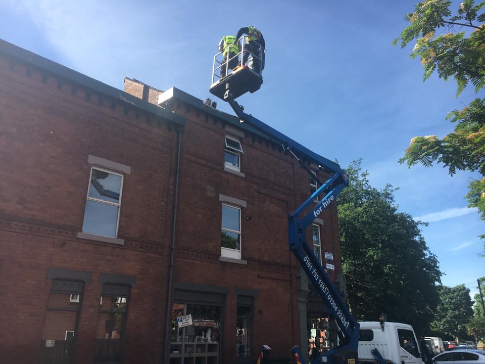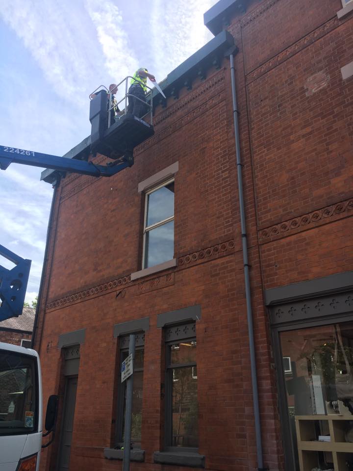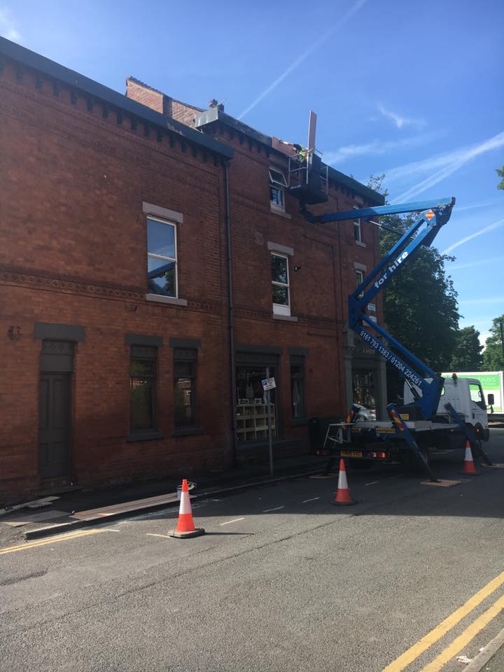 Finalfix joiners carrying out repairs to the fascia boards and roof on a commercial premises in Didsbury. Following our initial survey of the building it was found that several areas of the roof line were in poor condition and in need of repair. Due to access issues at the site, and for health and safety reasons we hired a cherry picker for the work. Use of the cherry picker can often reduce costs by enabling the contractors to carry out the repairs more efficiently than they could off ladders.